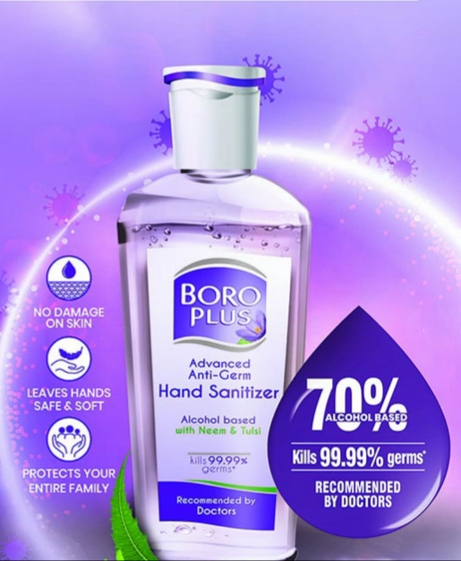 The BoroPlus Advanced Anti-Germ Hand Sanitizer, powered by the natural antiseptic qualities of Neem and Tulsi, has an alcohol base of 70% and is clinically proven to kill 99.99% of illness-causing germs within seconds.